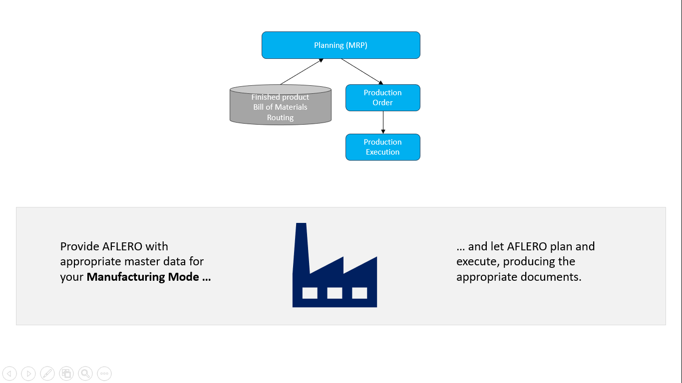 | Mode | How does AFLERO record “Bill of Materials” data? | How does AFLERO handle “Routing” data? | How does AFLERO plan/control production activity? | How does AFLERO record production execution results? |
